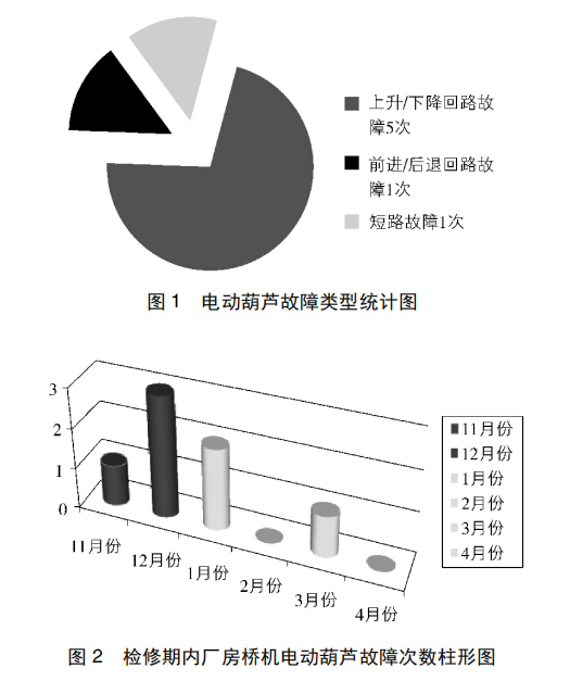 通過對 2013—2014 年檢修期電動葫蘆故障類型統(tǒng)計(jì)( 圖 1) 及檢修期內(nèi)廠房橋機(jī)電動葫蘆故障次數(shù)柱形圖( 圖 2) 的調(diào)查分析得出: 上升/下降控制回路故障次數(shù)為5 次,前進(jìn)/后退控制回路故障 1 次,短路故障 1 次。由此可見,電動葫蘆控制回路的可靠性有待進(jìn)一步提高。