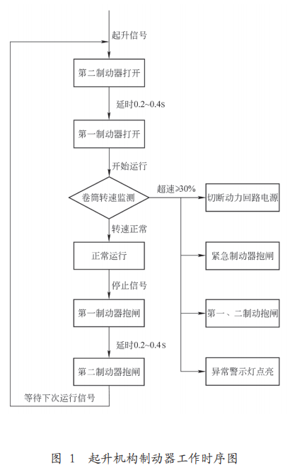 上述 3 套制動(dòng)器裝置均能夠單獨(dú)可靠地支撐額定載荷,其中第三制動(dòng)器直接作用于卷筒軸,在工作制動(dòng)器出現(xiàn)故障、電機(jī)斷軸或減速器中出現(xiàn)故障時(shí)能夠可靠地支撐載荷。此設(shè)計(jì)目的是在安全冗余較為嚴(yán)苛的場(chǎng)合下為用戶提供一種更加安全有效的起重設(shè)備。制動(dòng)器具體工作時(shí)序如圖 1 所示。
