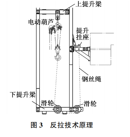 將電動葫蘆固定在架體上,隨架體升降,避免每次提升需倒換電動葫蘆。同時,針對傾覆力難以控制的問題,智能附著式升降腳手架采用滑輪換向,即采用鋼絲繩一端固定在電動葫蘆下掛鉤,另一端固定在附墻掛座上,中間通過滑輪換向,滑輪與提升梁上固定點呈豎直狀態(tài)?避免角度變化,保證了傾覆力矩為恒定值,且受力明確,架體升降時只需倒換鋼絲繩即可大大降低了倒換難度如圖3所示。電動葫蘆反拉技術的特點如下: