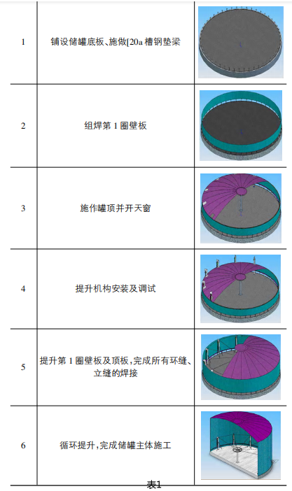 該工法主要施工順序:鋪設儲罐底板→組焊第1圈壁板→施做罐頂→灌頂開天窗(便于提升立柱傳出)→提升機構安裝及調試、組焊第2圈壁板(預留外側立縫1條不焊)→提升第2圈壁板及頂板至預定高度的一半,檢查及調整提升效果→繼續(xù)提升至預定高度→調整環(huán)縫間隙及錯邊,收緊第2圈壁板合口→完成所有環(huán)縫、立縫的焊接→提升機構下落→重復上述提升,完成底端壁板。施工流程及順序件表1所示。