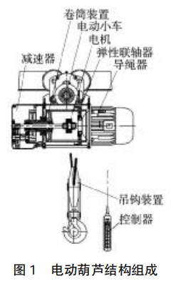 電動(dòng)葫蘆通常稱為電葫蘆,是一種常見的輕小型的起重設(shè)備。常見電動(dòng)葫蘆的控制方式有兩種,一是使用按鈕在地面跟隨操作,二是在司機(jī)室內(nèi)操控或采用無(wú)線遠(yuǎn)距離控制。電動(dòng)葫蘆一般由電機(jī)、傳動(dòng)機(jī)構(gòu)和卷筒裝置或鏈輪機(jī)構(gòu)組成。電動(dòng)葫蘆可以分為鋼絲繩電動(dòng)葫蘆和環(huán)鏈電動(dòng)葫蘆兩種。鋼絲繩電動(dòng)葫蘆可以分為鋼絲繩電動(dòng)葫蘆和環(huán)鏈電動(dòng)葫蘆兩種。鋼絲繩電動(dòng)葫蘆又可以分為單速提升型、雙速提升型、微型電動(dòng)葫蘆、卷?yè)P(yáng)機(jī)、多功能提升機(jī)等多種類型?;S常用電葫蘆為微型電動(dòng)葫蘆或懸臂葫蘆,往往在加料或維修車間頻繁進(jìn)行檢維修作業(yè)的固定點(diǎn)位安裝,設(shè)備拆裝位置因綜合考慮現(xiàn)場(chǎng)空間安全和建造成本往往不會(huì)安裝電動(dòng)葫蘆,化工廠常用電動(dòng)葫蘆結(jié)構(gòu)組成如圖1所示。