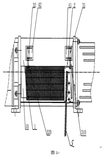 (1)包括位于卷筒外殼1的開口10處的導(dǎo)繩器2、導(dǎo)繩器2可沿著開口10左右移動,在導(dǎo)繩器2的移動區(qū)域相對應(yīng)的卷筒外殼1兩端附近設(shè)置有下止點限位行程開關(guān)32、上止點限位行程開關(guān)31,下止點限位行程開關(guān)32、上止點限位行程開關(guān)31分別通過左開關(guān)固定板42、右開關(guān)固定板41安裝到卷筒外殼1上,下止點限位行程開關(guān)32、上止點限位行程開關(guān)31分別串聯(lián)到鋼絲繩電動葫蘆的控制回路中,下止點限位行程開關(guān)32、上止點限位行程開關(guān)31分別具有下止點撓性拔桿320、上止點撓性拔桿310。