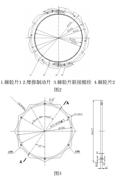 棘輪組件主要包括兩塊棘輪片、摩擦片、凸輪、聯(lián)接螺栓。兩塊棘輪片是兩個(gè)半圓形,用聯(lián)接螺栓鏈接起來(lái)合成一個(gè)整棘輪,壓緊摩擦片緊固在卷同上,調(diào)節(jié)聯(lián)接螺栓的松緊,可以調(diào)節(jié)摩擦片制動(dòng)摩擦阻力的大小。棘輪四周均勻分布12個(gè)輪槽和12個(gè)凸起,并均勻鉆有6個(gè)螺栓孔,用與凸輪聯(lián)接,如圖2所示。凸輪主要用來(lái)拔動(dòng)棘爪上的軸承,其上均勻分布12個(gè)凸起,四周也均勻鉆有6個(gè)螺栓孔,用螺栓將凸輪緊固在棘輪片上并使凸輪的凸起與棘輪的輪槽保持適當(dāng)?shù)木嚯x,如圖3所示。