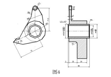 棘爪組件主要包括棘爪板、銷(xiāo)軸、軸承。棘爪組件的棘爪板形狀如圖4所示,其中心裝有銷(xiāo)軸,安裝在葫蘆外殼上,棘爪可以繞銷(xiāo)軸作一定角度的擺動(dòng),棘爪板上端有軸承,軸承與棘輪組件上的凸輪接觸。