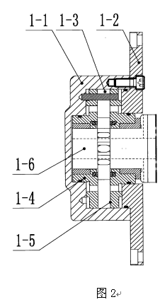 (2)如圖2所示,其中:非圓輪系液壓馬達(dá)1主要由殼體1-1、前端蓋1-2、非圓輪齒輪組1-3、上配流盤1-4、下配流盤1-5、軸1-6組成,該部分的主要功能是將壓力水、壓力油等液壓源的液壓能轉(zhuǎn)換成旋轉(zhuǎn)的機(jī)械能驅(qū)動手拉葫蘆進(jìn)行工作。如圖5所示,所述非圓輪齒輪組由外齒圈1-3-1、轉(zhuǎn)子1-3-2及滾輪1-3-3組成,所述滾輪1-3-3設(shè)在內(nèi)部,轉(zhuǎn)子1-3-2設(shè)在滾輪1-3-3和外齒圈1-3-1中間,通過轉(zhuǎn)子1-3-2帶動滾輪1-3-3和外齒圈1-3-1轉(zhuǎn)動。