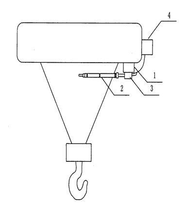 當(dāng)電動(dòng)葫蘆吊鉤懸掛的物體上升至開關(guān)探針的檢測(cè)范圍之內(nèi),開關(guān)探針就能檢測(cè)到物體的位置信息,所述報(bào)警檢測(cè)裝置2通過報(bào)警啟動(dòng)開關(guān)3與報(bào)警裝置4電連接起來,所述報(bào)警裝置4為聲音報(bào)警裝置或燈光報(bào)警裝置,當(dāng)開關(guān)探針檢測(cè)到物體的位置信息后,傳輸?shù)絾?dòng)開關(guān)3中,從而啟動(dòng)報(bào)警裝置4,報(bào)警裝置4通過聲音或燈光將信息傳輸給工作人員,以便于引起他們的注意,防止電動(dòng)葫蘆因過度上升而碰撞損壞,有效地保證電動(dòng)葫蘆的安全使用。