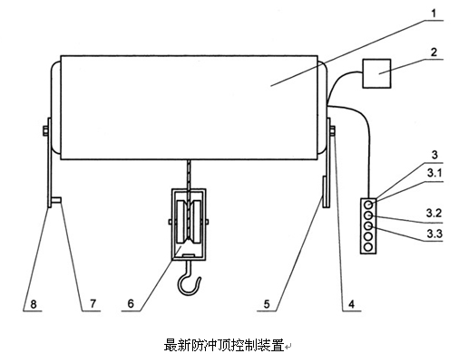 新研制的采用光電技術(shù)的防沖頂技術(shù),當(dāng)電動(dòng)葫蘆的掛鉤向上運(yùn)行到掛鉤上頂面距離電動(dòng)葫蘆外殼下沿A+100 mm處,光電開關(guān)與光電開關(guān)反射板之間被掛鉤遮擋,由光電控制電路使掛鉤上升停止,停止在上行極限位置之下。本發(fā)明的構(gòu)思新穎、結(jié)構(gòu)輕巧、制作簡(jiǎn)單、成本低廉,使用方便、動(dòng)作靈敏、安全可靠,消除安全隱患,是用光電技術(shù)解決電動(dòng)葫蘆防沖頂?shù)男峦黄啤?蓮V泛推廣應(yīng)用于所有電動(dòng)葫蘆生產(chǎn)企業(yè)的新產(chǎn)品制造中,也可推廣應(yīng)用于所有電動(dòng)葫蘆使用單位,對(duì)電動(dòng)葫蘆進(jìn)行技術(shù)改造,增加安全保障,消除安全隱患。