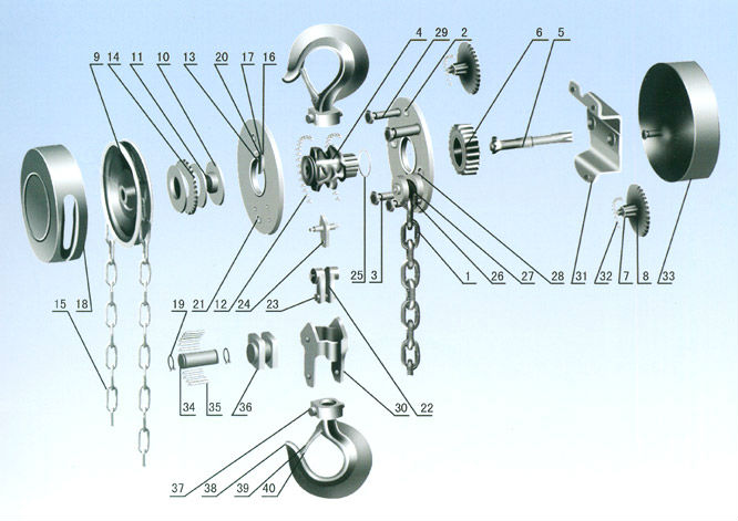 備注:圖中1起重鏈、2右墻板、3支撐桿、4起重鏈輪、5 為5齒長(zhǎng)軸、6花鍵孔齒輪、7為4齒短軸、8片齒輪、9手鏈輪、10制動(dòng)器座、11摩擦片、12滾柱、13軸承外圈、14棘輪、15手鏈條、16棘爪彈簧、17棘爪、18手鏈輪罩殼、19彈性擋圈、20棘爪銷(xiāo)、21、左墻板、22吊鏈板、23吊銷(xiāo)、24擋板、25彈性擋圈、26軸銷(xiāo)、27手輪、29、支撐桿、30下構(gòu)架、31外墻板、32滾柱、33罩殼、34游輪軸、35、滾桿、36游輪、38吊鉤、39止索夾、40無(wú)頭鉚釘。