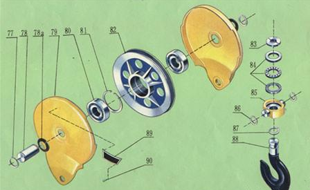 北京凌鷹電動(dòng)葫蘆吊鉤部件有兩種形式:(1)一只滑輪的單輪式,適用于纏繞鋼絲繩為兩支(2/1出繩)的起升機(jī)構(gòu)上;兩只滑輪的雙滑式,適用于纏繞鋼絲繩為四支(4/2或4/1出繩)的起升機(jī)構(gòu)上。吊鉤組:符合起重吊鉤GB/T1005.1~5-98標(biāo)準(zhǔn),材質(zhì)為DG20,安全系數(shù)大于5;吊鉤表面光潔無(wú)裂紋、折疊、過(guò)燒等缺陷;內(nèi)部無(wú)裂紋、白點(diǎn)和其他影響使用安全的夾雜物等其他缺陷。吊鉤帶有防止鋼絲繩脫鉤的防脫鉤裝置。確保吊鉤在使用過(guò)程中的安全可靠性。