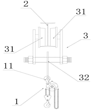 移動式手拉葫蘆更能很好的完成操作任務,可以實現(xiàn)上下左右行走,使操作更加方便。下圖為移動式手拉葫蘆實現(xiàn)結(jié)構(gòu)圖,其中1為手拉葫蘆,2為工字鋼,3為滑行小車,11為手拉葫蘆的上吊鉤,31為滾輪,32為安裝支架。