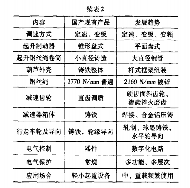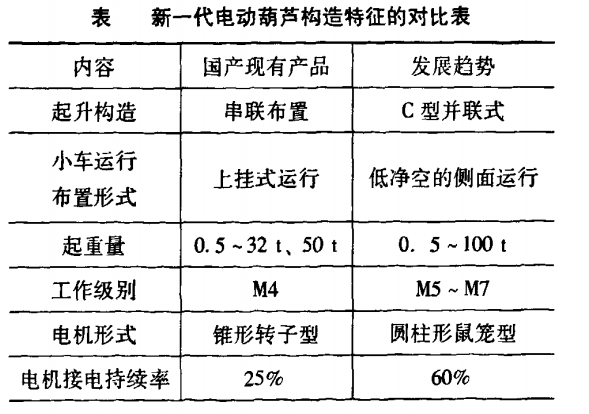 鋼絲繩電動葫蘆之后的發(fā)展方向應(yīng)向重載、大型、高性能化、模塊化發(fā)展,成為替代通用橋式起重機(jī)的發(fā)展趨勢。新一代的電動葫蘆與現(xiàn)有產(chǎn)品的構(gòu)造特征對比表如下: